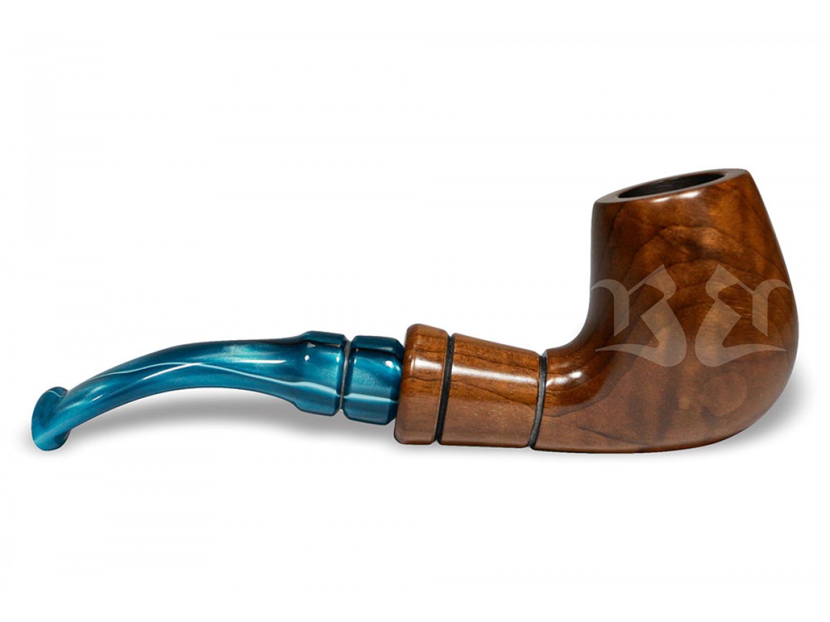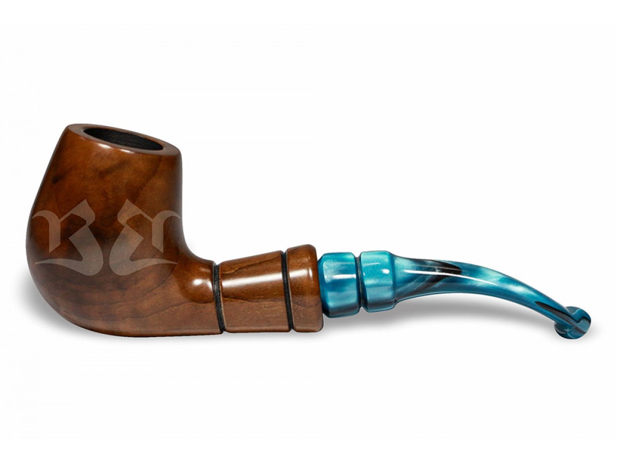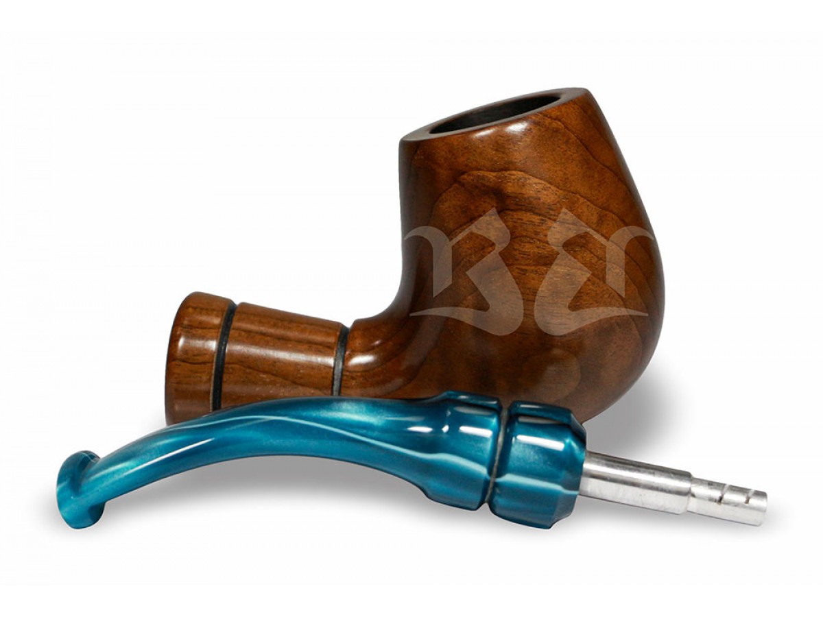 A piteira em acrílico europeu azul perolado adiciona personalidade e sofisticação ao conjunto, criando um contraste elegante com a madeira natural. Seu acabamento translúcido e vibrante valoriza o design da peça, tornando o cachimbo visualmente marcante e distinto.